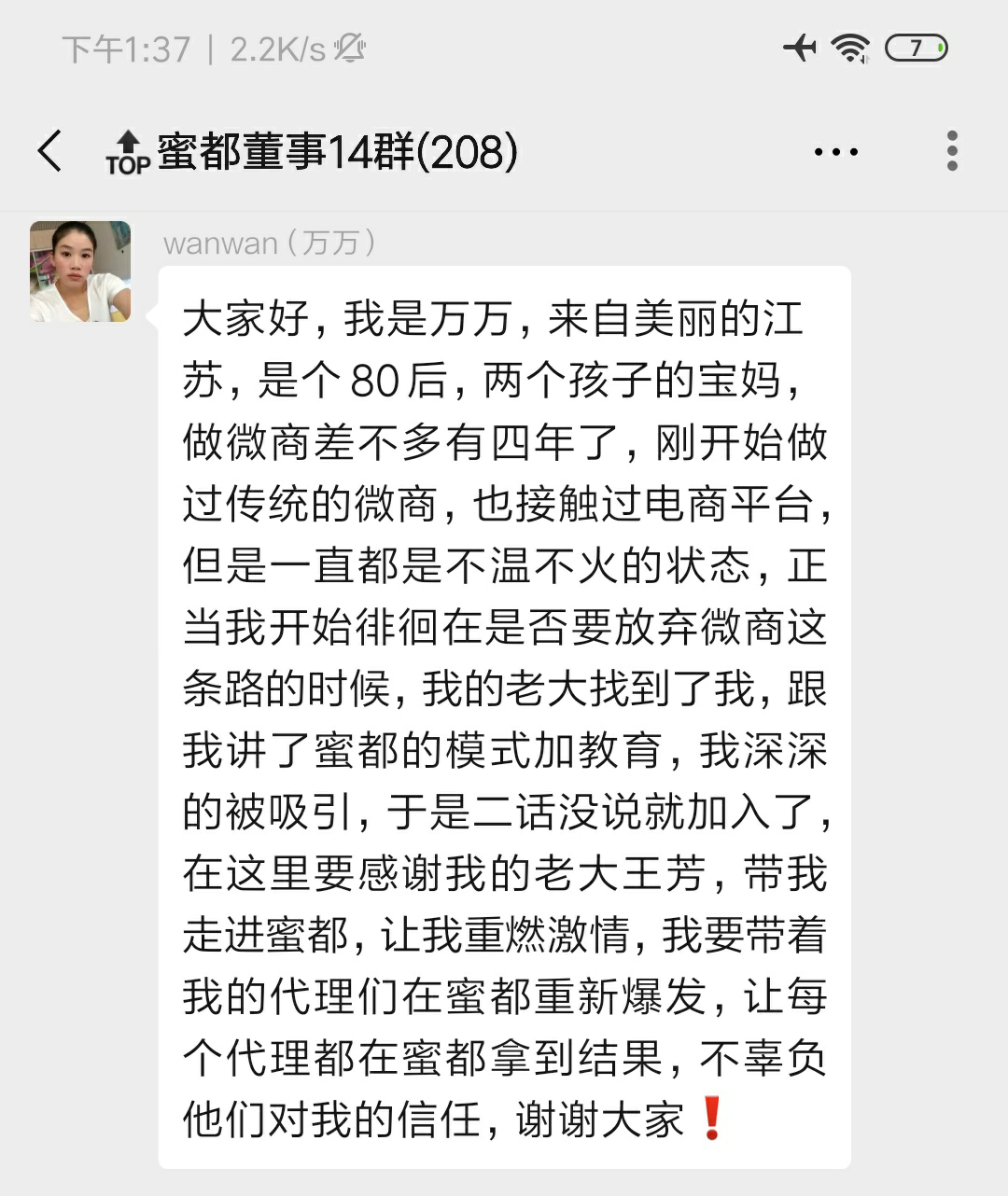 大家好,我是万万,来自美丽的江苏,是个80后,两个孩子的宝妈,做微商差不多有四年了,刚开始做过传统的微商,也接触过电商平台,但是一直都是不温不火的状态,正当我开始徘徊在是否要放弃微商这条路的时候,我的老大找到了我,跟我讲了蜜都的模式加教育,我深深的被吸引,于是二话没说就加入了,在这里要感谢我的老大王芳,带我走进蜜都,让我重燃激情,我要带着我的代理们在蜜都重新爆发,让每个代理都在蜜都拿到结果,不辜负他们对我的信任,谢谢大家❗