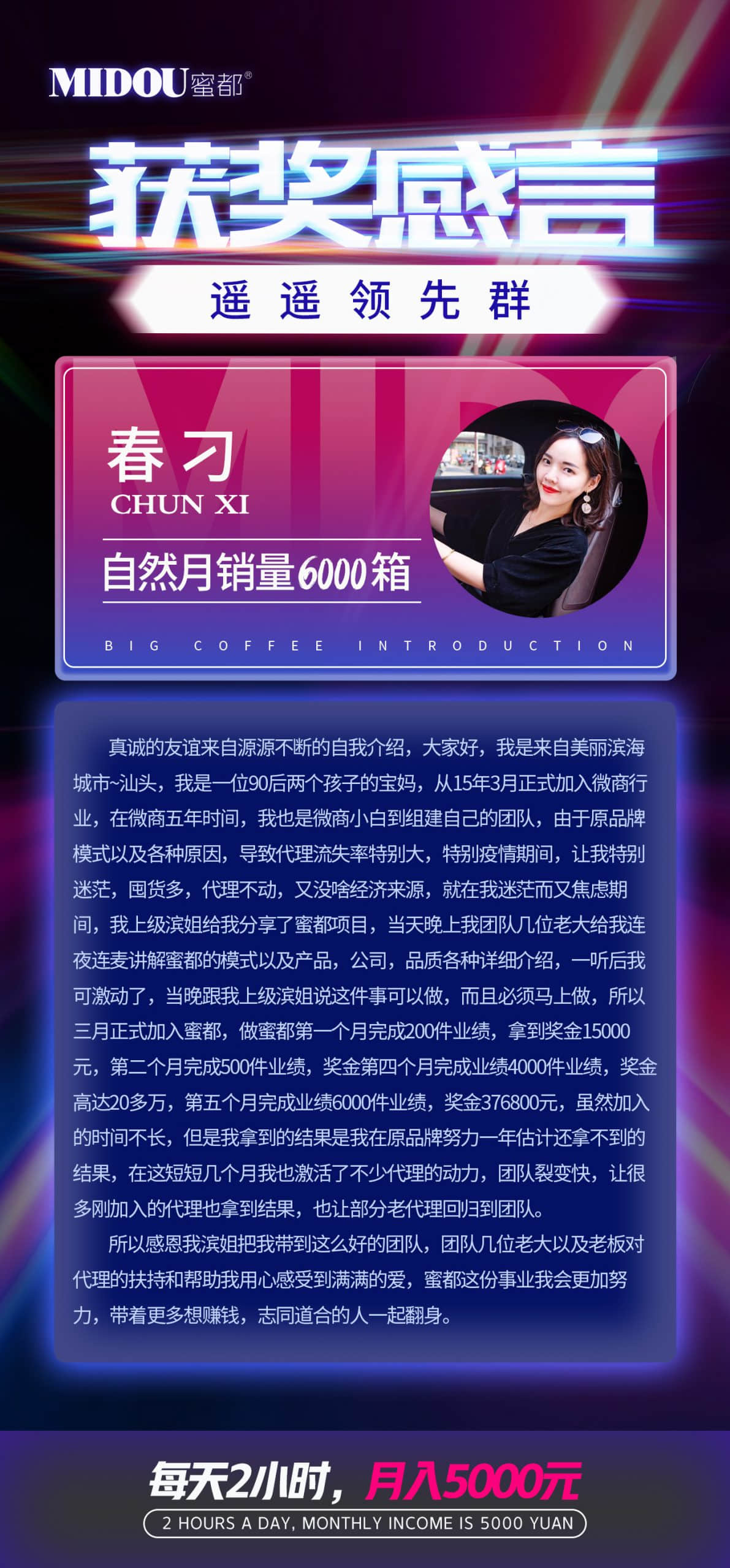 真诚的友谊来自源源不断的自我介绍,大家好,我是来自美丽滨海城市~汕头,我是一位90后两个孩子的宝妈,从15年3月正式加入微商行业,在微商五年时间,我也是微商小白到组建自己的团队,由于原品牌模式以及各种原因,导致代理流失率特别大,特别疫情期间,让我特别迷茫,囤货多,代理不动,又没啥经济来源,就在我迷茫而又焦虑期间,我上级滨姐给我分享了蜜都项目,当天晚上我团队几位老大给我连夜连麦讲解蜜都的模式以及产品,公司,品质各种详细介绍,一听后我可激动了,当晚跟我上级滨姐说这件事可以做,而且必须马上做,所以三月正式加入蜜都,做蜜都第一个月完成200件业绩,拿到奖金15000元,第二个月完成500件业绩,奖金第四个月完成业绩4000件业绩,奖金高达20多万,第五个月完成业绩6000件业绩,奖金376800元,虽然加入的时间不长,但是我拿到的结果是我在原品牌努力一年估计还拿不到的结果,在这短短几个月我也激活了不少代理的动力,团队裂变快,让很多刚加入的代理也拿到结果,也让部分老代理回归到团队,所以感恩我滨姐把我带到这么好的团队,团队几位老大以及老板对代理的扶持和帮助我用心感受到满满的爱,蜜都这份事业我会更加努力,带着更多想赚志同道合的人一起翻身