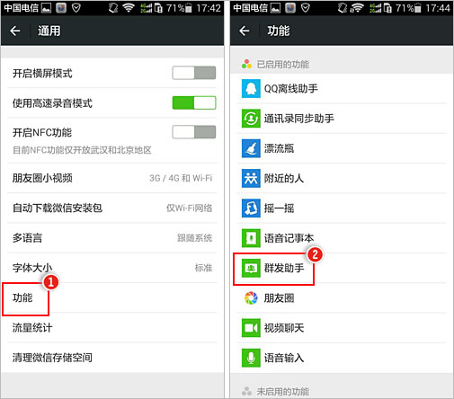 若您需要给多个好友群发相同的内容(在不创建群的情况下),您可以使用“群发助手”给各个好友群发消息,具体操作如下: